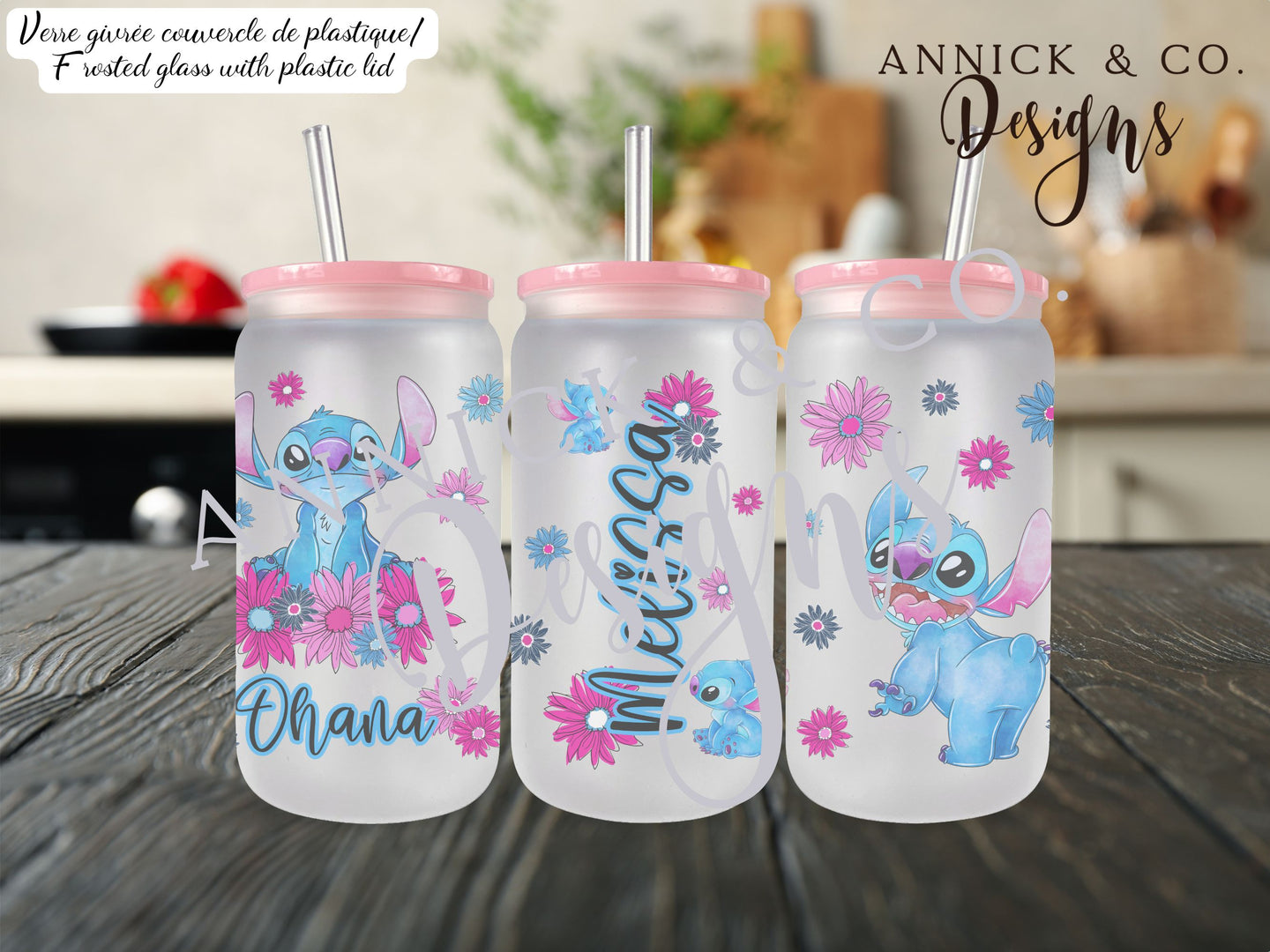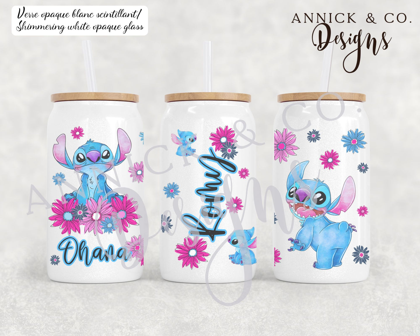 Stitch fan?! Here's a gorgeous iced coffee cup from Stitch! Available in your choice of a beautiful frosted glass tumbler, or a white glass tumbler with opalescent reflections. Add your name and this unique glass is sure to please any Stitch fan.