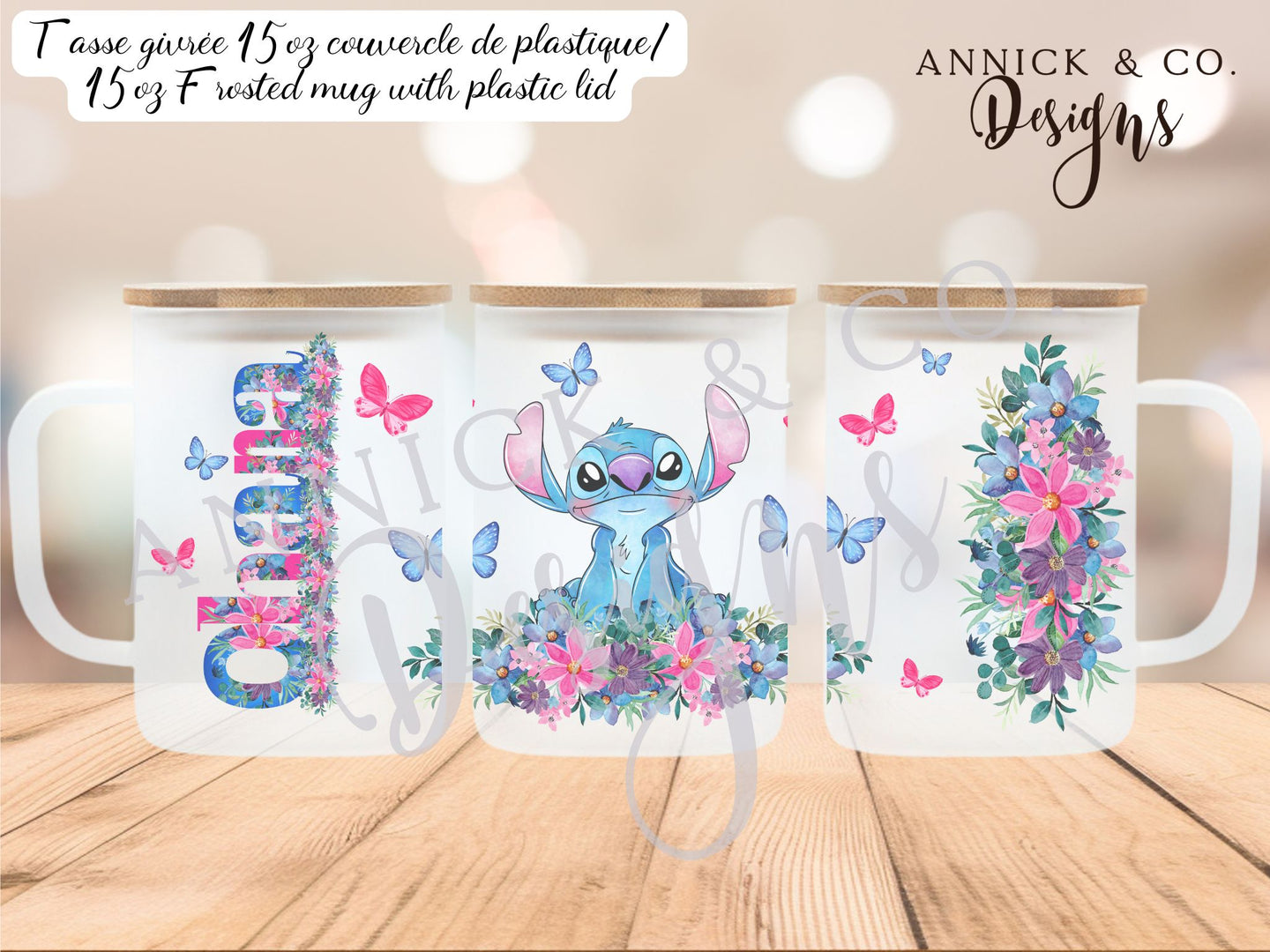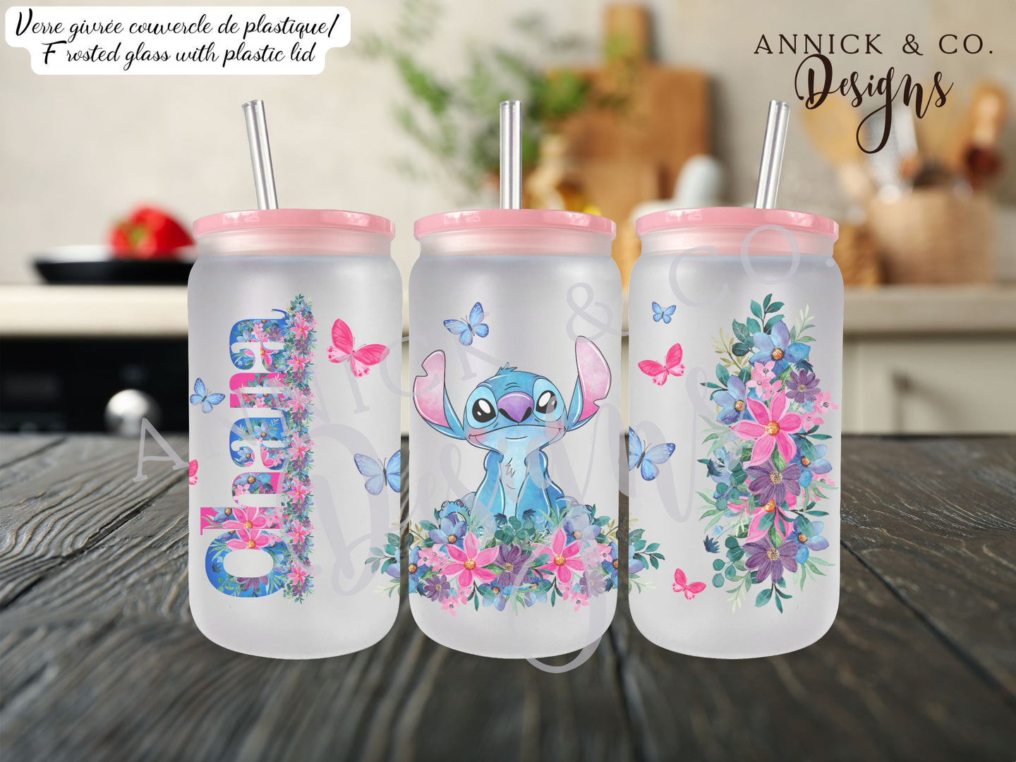 Fan de Stitch?! Voici un magnifique gobelet à café glacé de Stitch! Offert au choix, sur un superbe gobelet en verre dépoli,-grivré ou un gobelet en verre blanc scintillant\iridescent.